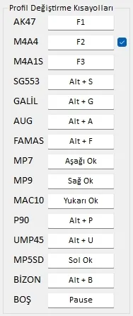 Burada belirleyeceğiniz kısayollar ile oyun içerisinde dilediğiniz silahın profilini aktif edebilirsiniz.