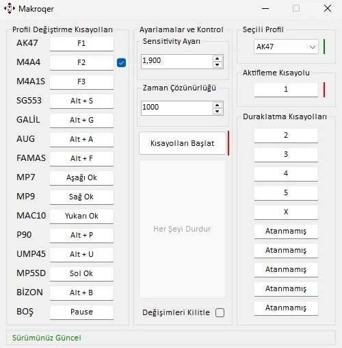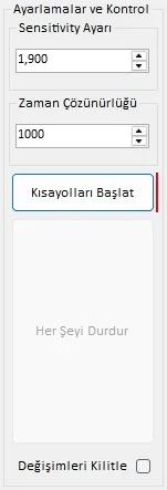 Bu alanda ise oyun içerisindeki hassasiyetinizi girmeniz için bir alan, oyun içerisinde kısayollar ile profil değiştirmeyi sağlamak için “Kısayolları Başlat” isimli bir buton, gerektiğinde uygulamayı durdurmak için “Her Şeyi Durdur” isimli bir buton ve son olarak da kısayolları belirlerken kullandığınız tuşların ve sensitivity ayarınızın yanlışlıkla değişmesini önlemek için “Değişimleri Kilitle” isimli bir özellik bulunmakta.